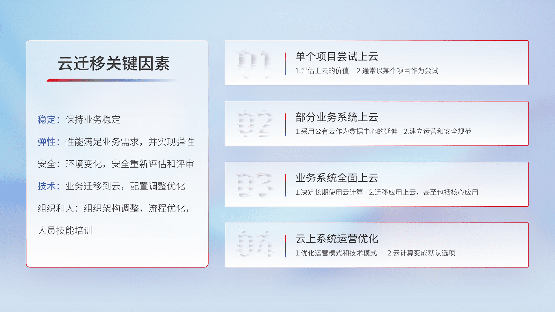 结合实际业务,,,从规划设计、、云平台选型、、、、云原生改造、、数据迁移、、、、集成交付,,,迁移全过程为客户识别最佳上云路径,,,,做好风险识别管理,,,设计网络架构、、、身份权限、、、安全审计合规、、操作审计、、日志审计、、监控告警策略、、、多站点容灾设计等,,对云上基础设施进行整体规划,,,提升IT治理水平,,以满足弹性、、、高可用、、高性能的需求。。。。
